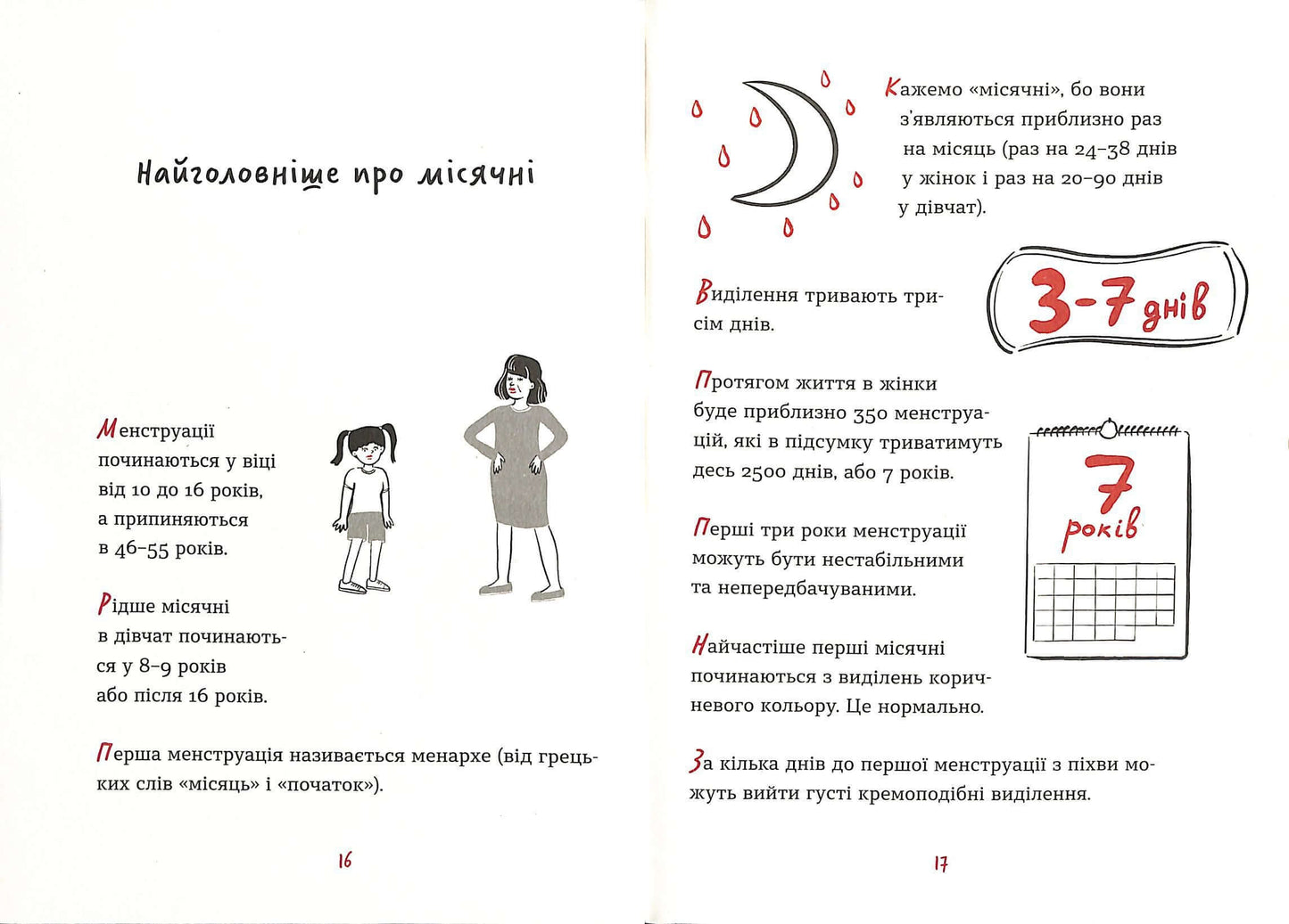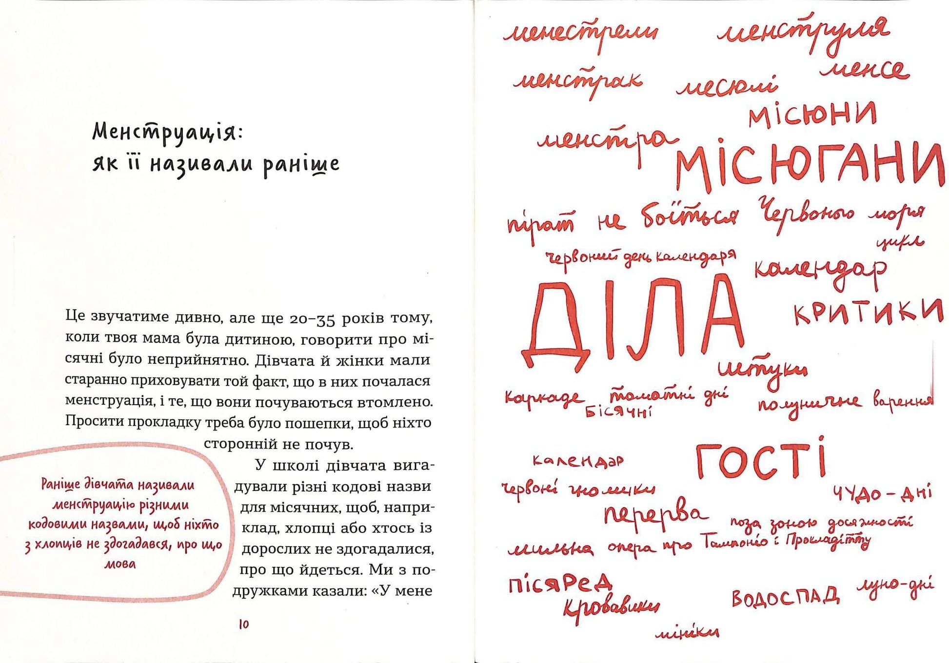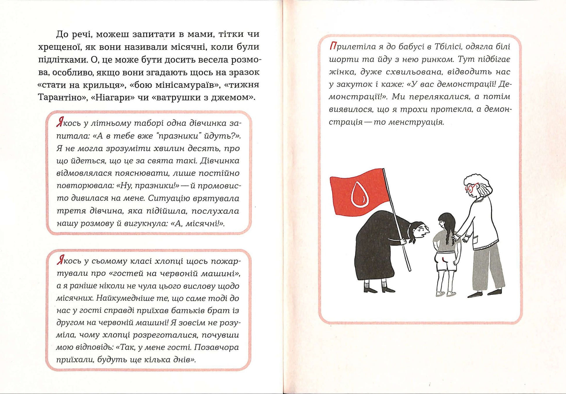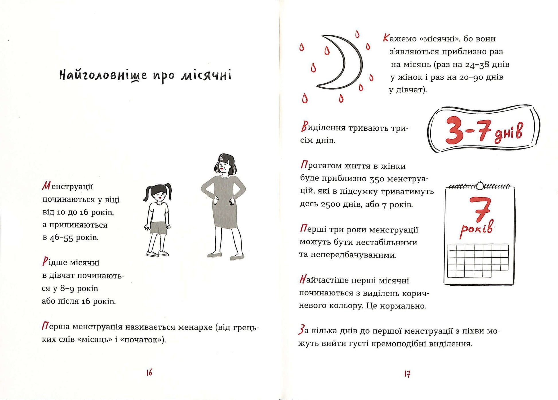 Як зрозуміти, що скоро почнуться місячні, яку білизну обрати й чим користуватися – прокладками, тампонами чи, може, чашами? Як сказати про це мамі та як говорити про менструацію з татом? Навіщо менструація взагалі потрібна і чи справді буде боляче?