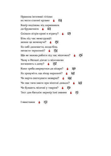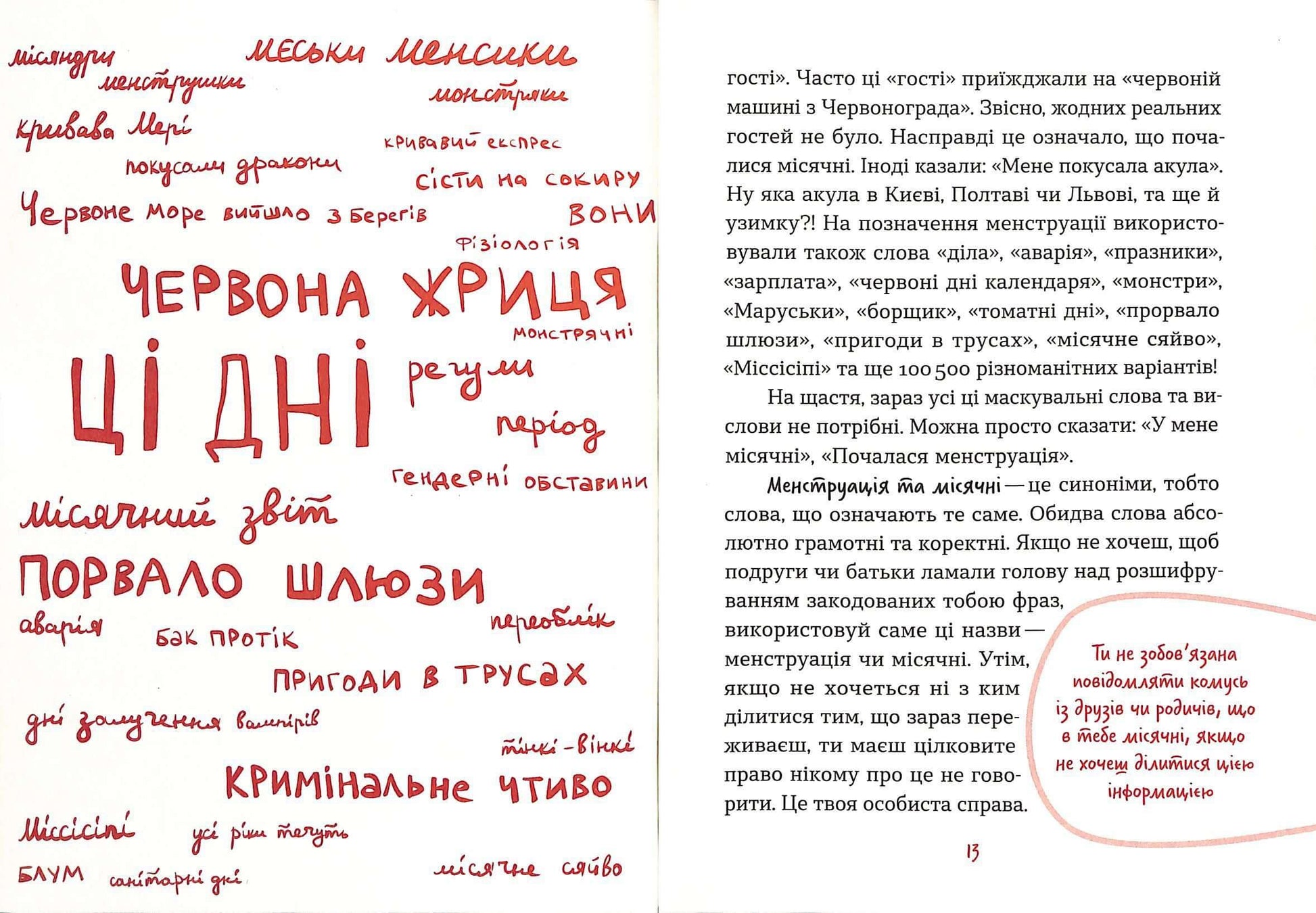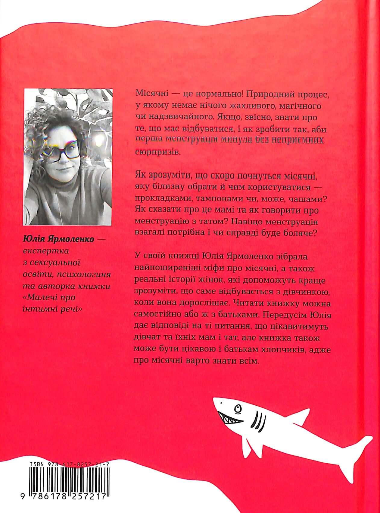 У своїй книжці Юлія Ярмоленко зібрала найпоширеніші міфи про місячні, а також реальні історії жінок, які допоможуть краще зрозуміти, що саме відбувається з дівчинкою, коли вона дорослішає. Читати книжку можна самостійно або ж з батьками. Передусім Юлія дає відповіді на ті питання, що цікавитимуть дівчат та їхніх мам і тат, але книжка також може бути цікавою і батькам хлопчиків, адже про місячні варто знати всім.