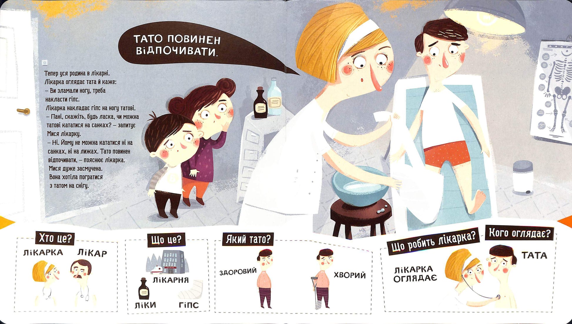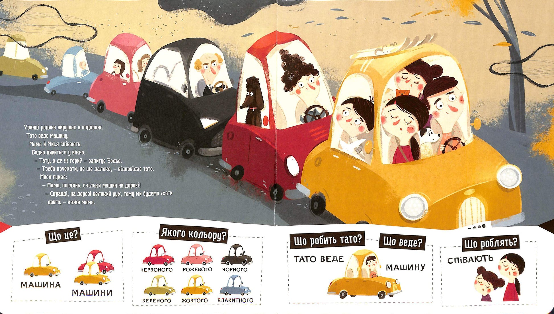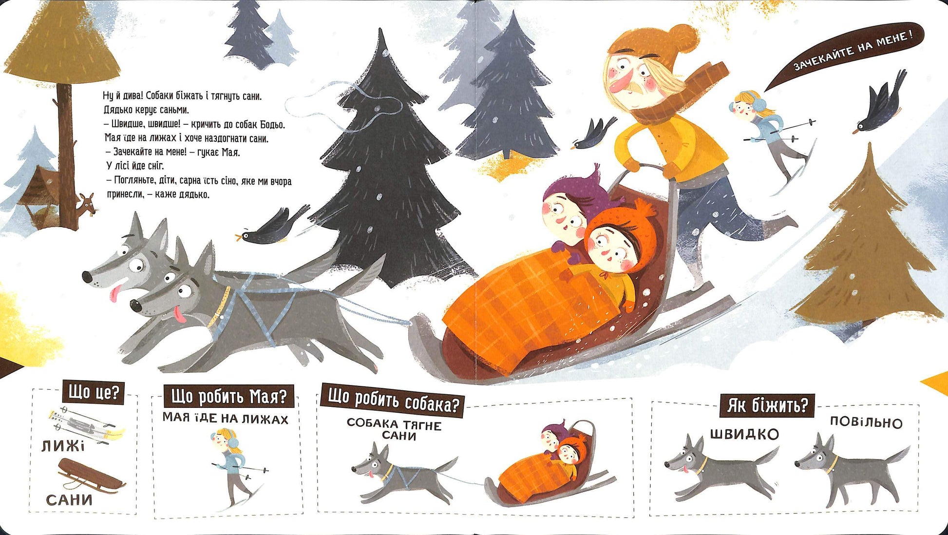 Третя книжка із серії про Бодя і його родину допоможе зробити наступний крок у розвитку мовлення: перейти до говоріння зв'язними реченнями, освоїти початки граматики. Вона буде корисною для дітей, що починають говорити реченнями. Одна книжка – чотири речі: вімельбух-історія, завдання-гра, розвиток мовлення і закріплення необхідних життєвих навичок. Книжка змальовує 17 знайомих дітям і пов’язаних між собою життєвих ситуацій: родина Бодя готується до подорожі, їде автомобілем у гості до родичів, усі вітаються, разом обідають і вирушають до лісу, де залишають їжу для тварин, потім родина майструє годівничку, вечеряє, наступного дня катається на санчатах та ковзанах, ліпить сніговика, з’їжджають з гори на лижах, тато отримує травму і потрапляє до лікарні, його оглядає лікарка і накладає гіпс, усі разом проводять тихий вечір біля коминка, на ранок родина Бодя прощається з родичами і їде додому, де переглядає фото з відпочинку. Читати, роздивлятися, закріплювати необхідні вікові навички, гратися, виконуючи завдання, і навчатися — ось що значить проводити час разом із дитиною якісно, а це і є першочерговою місією книжок серії "Я граюся, я вчуся". Історії спеціально  побудовані таким чином, щоб сприяти використанню лексики і розвитку мовлення відповідно до віку, а також побудові динамічних стереотипів. . В книзі є тексти-підказки до мальованих історій, можна нічого і не вигадувати, як в традиційному вімельбуху.  Структура книжки містить інструкцію для батьків, знайомство з персонажами, вімельбух-історії, мальовані завдання і наприкінці книжки — узагальнювальні завдання для дітей.