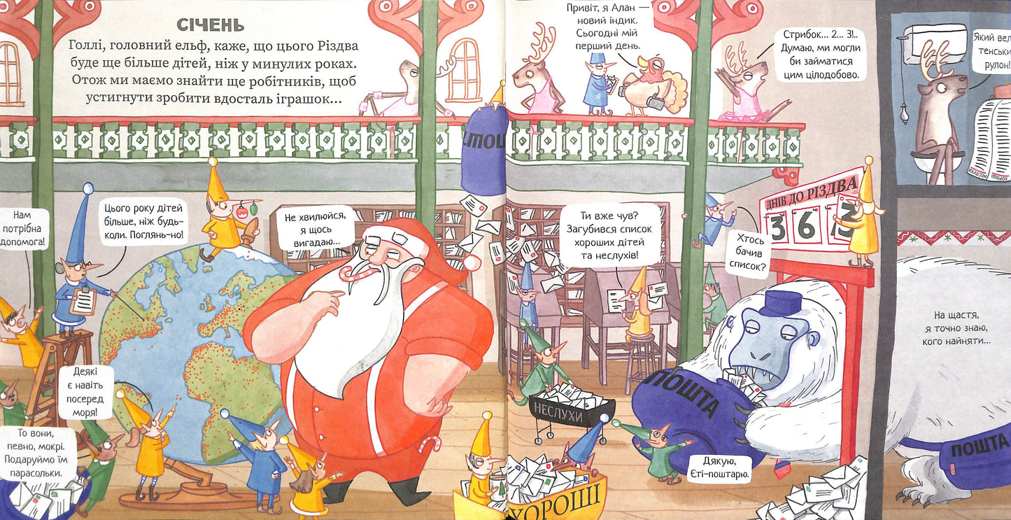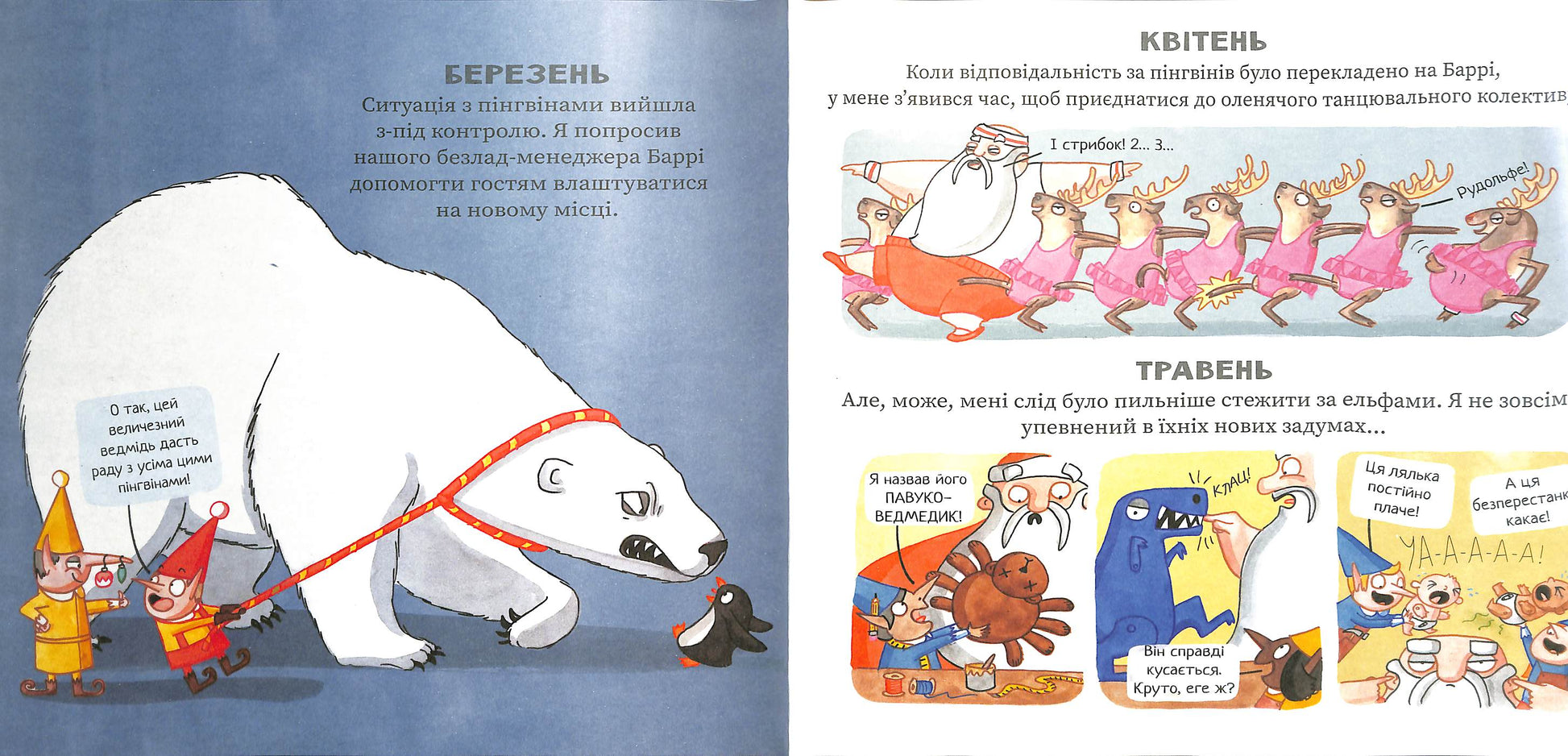 Будьте готові, що «Чарівна майстерня Санти» — це ну дуже весела історія, де у коміксовому вигляді зображений кожний місяць підготовки Санти до Різдва. З нею гарантовано вдасться підняти настрій та пореготати від щирого серця!