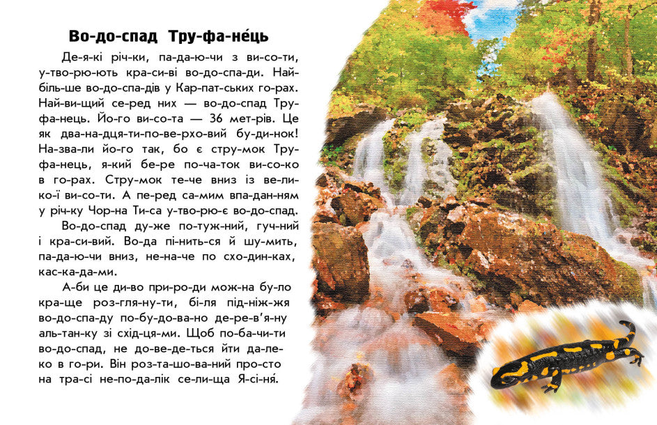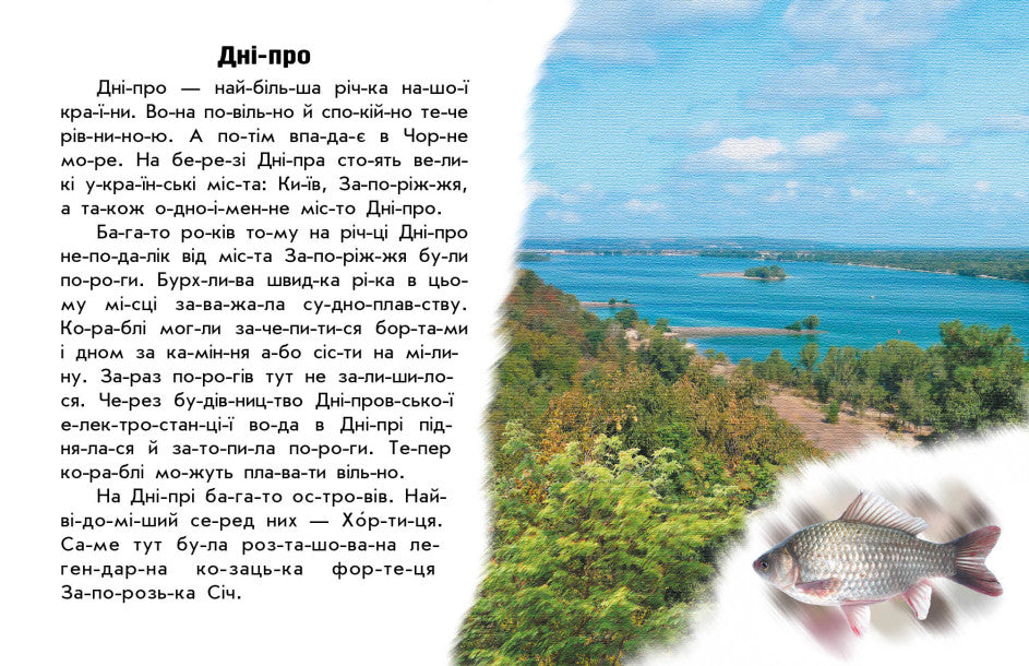 У цій книжці з серії "Чи-та-ю про Україну" зібрані короткі оповідання, які познайомлять маленьких читачів, що тільки навчаються читати з річками та озерами нашої України. Для вибудови правильного ритму та розподілу дихання усі слова в текстах поділені на склади. Чудові реалістичні картинки доповнять враження від текстів. За допомогою текстів та ілюстрацій малюк не тільки здобуде навичок читання, а й познайомиться з рідним краєм.