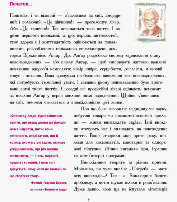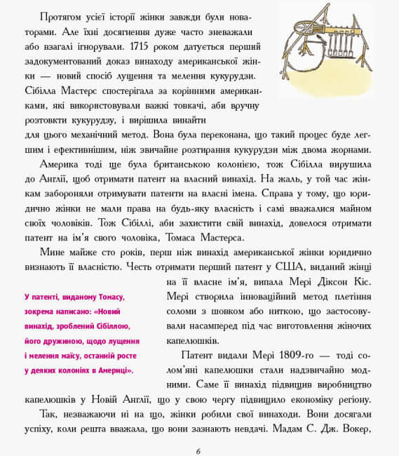 Дівчата думають про все на світі, і то є факт. Від підгузків для дітей до найтривкішого матеріалу, який застосовують у космосі. Замислившись одного разу, як зробити життя більш легким, жінки сіли за створення свого геніального винаходу. Їхні наполегливість, оптимізм і віра в свої сили дали поштовх на створення речей, яким і досьогодні немає рівних. Історії цих жінок надихають і допомагають у важку хвилину не здаватися, а йти до своєї мети. Можливо, наступний патент стане твоїм?