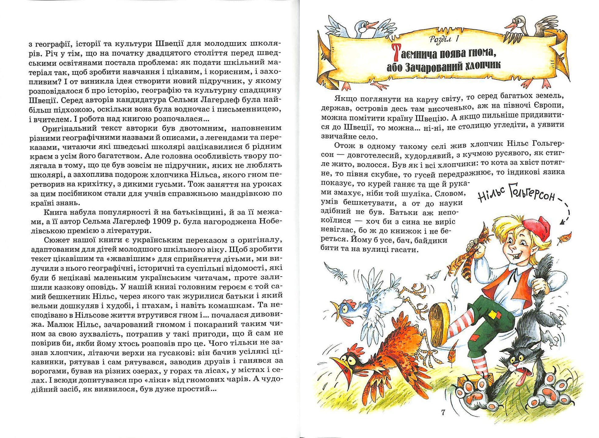 Тримаючи в руках чудову книгу "Дивовижна подорож Нільса з дикими гусьми", читач з подивом розуміє, що хоча він багато разів чув про ці пригоди, не раз дивився мультфільм, але йому знову і знову хочеться заглибитися в історію про хлопчика Нільса і його товариша гусака Мартина. Дивного та веселого гнома, який полюбляє ранкові купання у лісовому озері, полчище злих пацюків, що нещадно знущається над зграєю лелек, та справжню дружбу, яка перемагає всі негаразди.