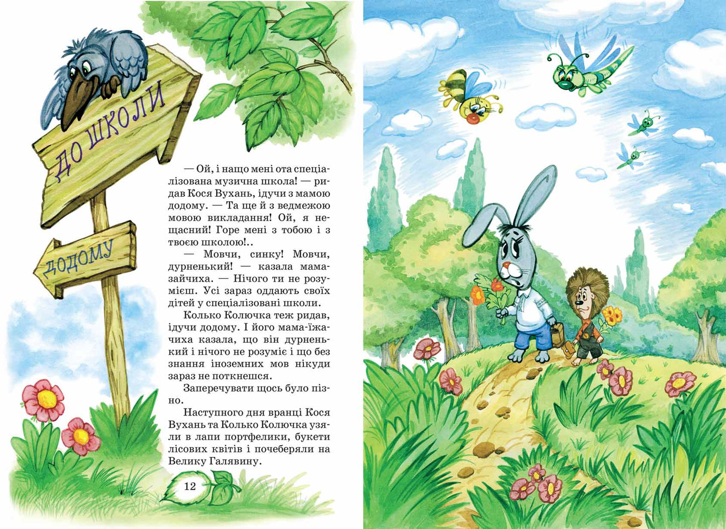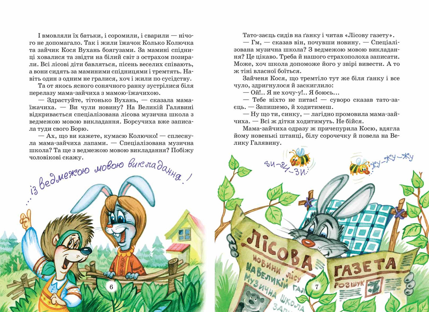 Легка, життєрадісна, сповнена доброго гумору книга розповідає про веселі, дотепні пригоди зайчика, їжачка та їхніх однокласників, учнів спеціалізованої музичної лісової школи з ведмежою мовою викладання. Для дітей молодшого та середнього шкільного віку.