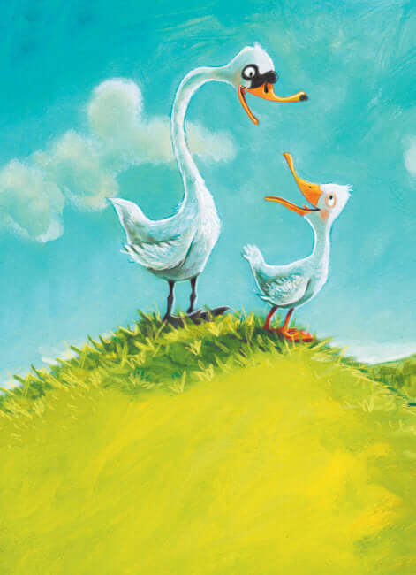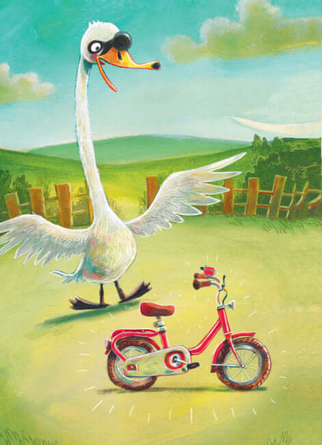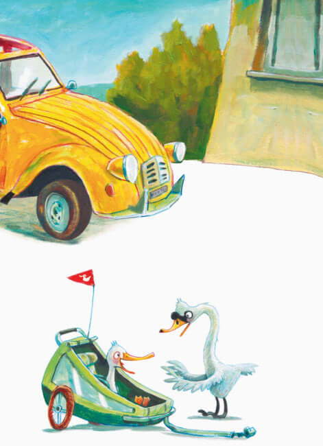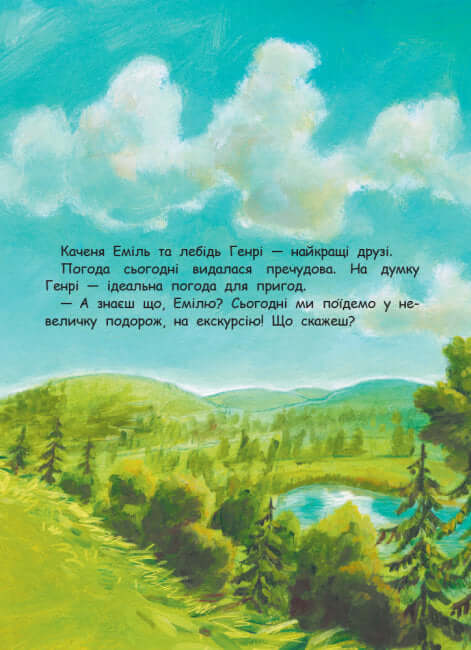 Каченя Еміль не вміє кататися на велосипеді. А після першої спроби і першого падіння навіть слухати не хоче про цей транспорт. Але що ж робити, коли на дворі чудова погода і дуже кортить вирушити в подорож із найкращим другом? На щастя, лебідь Генрі знає, як заспокоїти плаксиве каченя та допомогти йому подолати свій страх. А заразом він навчить цього маленьких читачів і читачок та їхніх батьків.