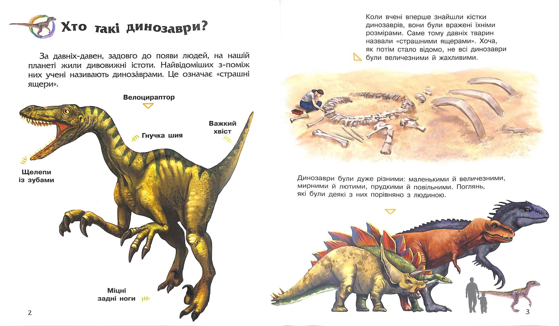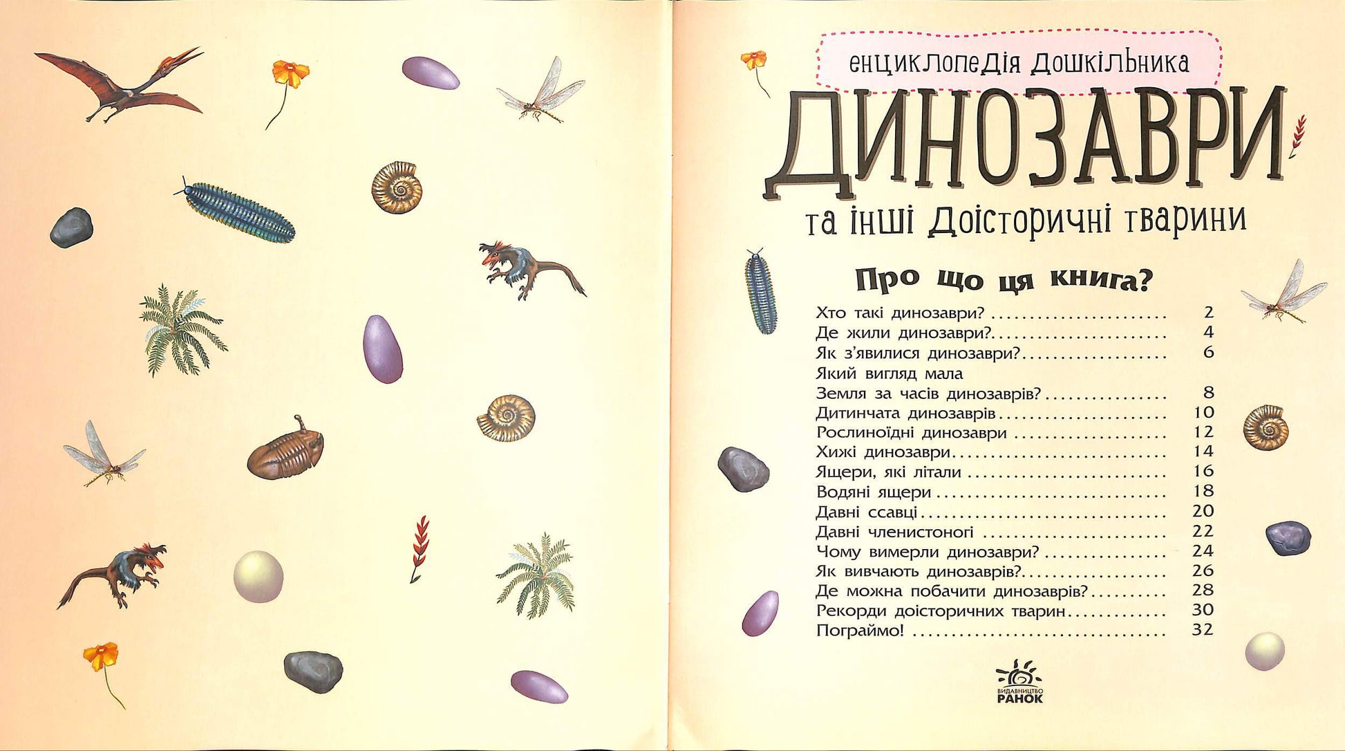 Розглядайте разом картинки, читайте тексти, дізнавайтеся про величезних динозаврів, літаючих і водяних ящерів, волохатих мамонтів та інших доісторичних тварин. Книга допоможе допитливій малечі отримати загальне уявлення про давніх тварин, вивчити нові слова, дізнатися багато цікавого про доісторичний світ.