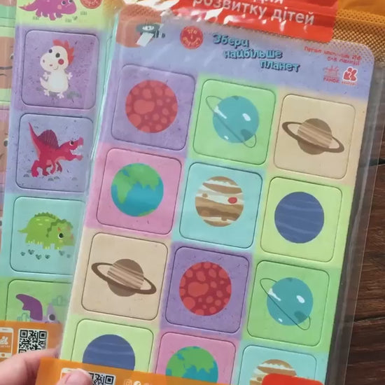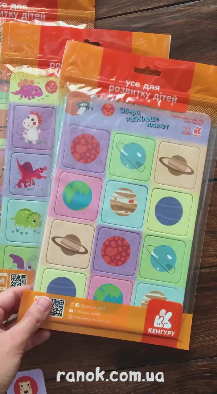 Компактна настільна гра, яку можна взяти із собою в дорогу. Набір складається з 24-х маленьких карток, грального кубика й мішечка. Він не займе багато місця й допоможе весело і з користю провести час! Гра сприяє розвитку дрібної моторики, комунікативних навичок, уваги, покращенню навичок усної лічби.
