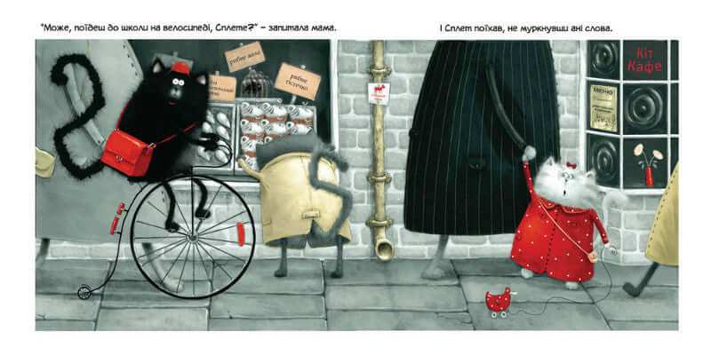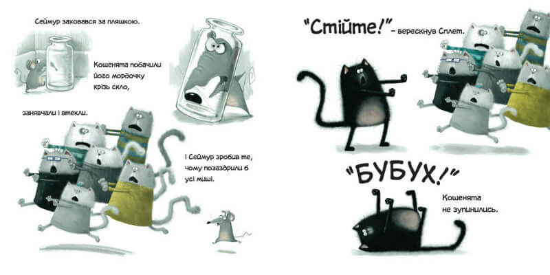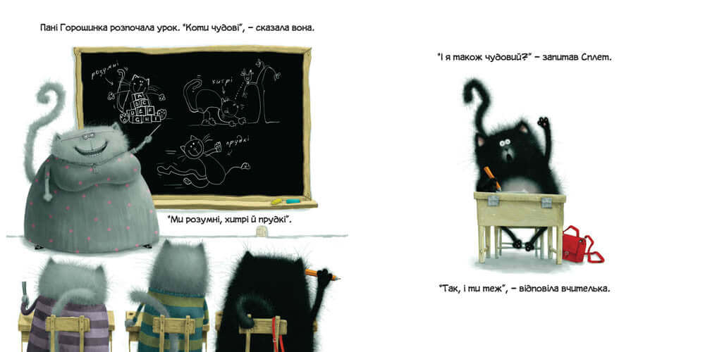 Кіт на ім’я Сплет уперше йде до школи і дуже хвилюється: раптом він там ні з ким не заприятелює? Тому, про всяк випадок, ховає у коробку з обідом своє хатнє мишенятко – Сеймура – і бере його з собою до школи. Учителька, пані Горошинка, знайомить Сплета з класом і розпочинає урок. Коли Сеймур вистрибує з коробки, кошенята роблять те, що й усі коти – вони ловлять мишеня! Бідолашний Сплет! Невже він втратить і свого давнього приятеля, і всіх нових?! Мудра пані Горошинка втручається саме вчасно, і її учні вивчають новий, дуже важливий урок… Виходить, у Котячій школі може бути дуже цікаво!