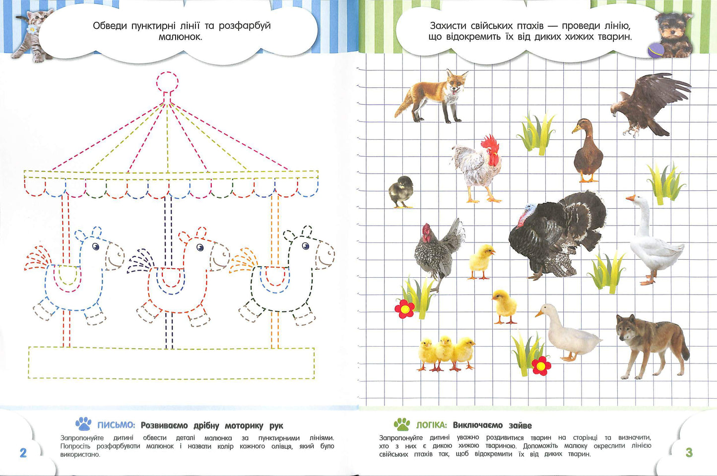 Серія книжок с розвивальними завданнями для дошкільнят. Кожна книга серії орієнтована на певний вік (4, 5 або 6 років) та відповідає освітній програмі МОН України «Дитина». Одна сторінка — одне завдання, яскраві малюнки та цікаві вправи. Внизу кожної сторінки розташовані методичні рекомендації, які допоможуть дорослому правильно зорієнтувати малюка. У цій книзі є всі типи завдань, необхідних для розвитку дитини дошкільного віку. Відповідно до освітньої програми МОН України «Дитина» ваш малюк робитиме перші кроки у пізнаванні букв та читанні, вивчить або згадає числа і виконає завдання з ними. Корисні та цікаві ігри, наведені у цій книзі, сприятимуть розвиткові дрібної моторики рук вашої дитини. Більшість завдань малюк зможе виконати сам. Але якщо йому буде складно, то допоможуть підказки для батьків! Внизу кожної сторінки із завданням є поради педагога: на що слід звернути увагу дитини, як підказати їй шлях до розв’язання завдання тощо.