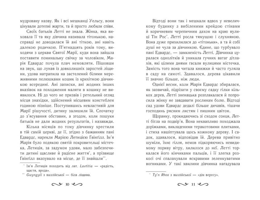 Якщо вірити пані Марії, солоне повітря Уельсу просотане магією фейрі та друїдів і на кожному кроці можна наткнутися на щось потойбічне. Так одного дня у хащах білої ліщини жінка знаходить… маля. Пані Марія любить і виховує дитину як рідну доньку. От тільки жінку не полишає відчуття, що дівчинка – чужинка в цьому світі. Те саме впродовж п’ятнадцяти років відчуває й сама вихованиця. Але Доля – вправний гравець і ніколи не розкриває карти завчасно. Тож лише зараз настає час дізнатися: ХТО ТАКА НАСПРАВДІ ЛЕТТІ ҐВІНҐІЛЛ?