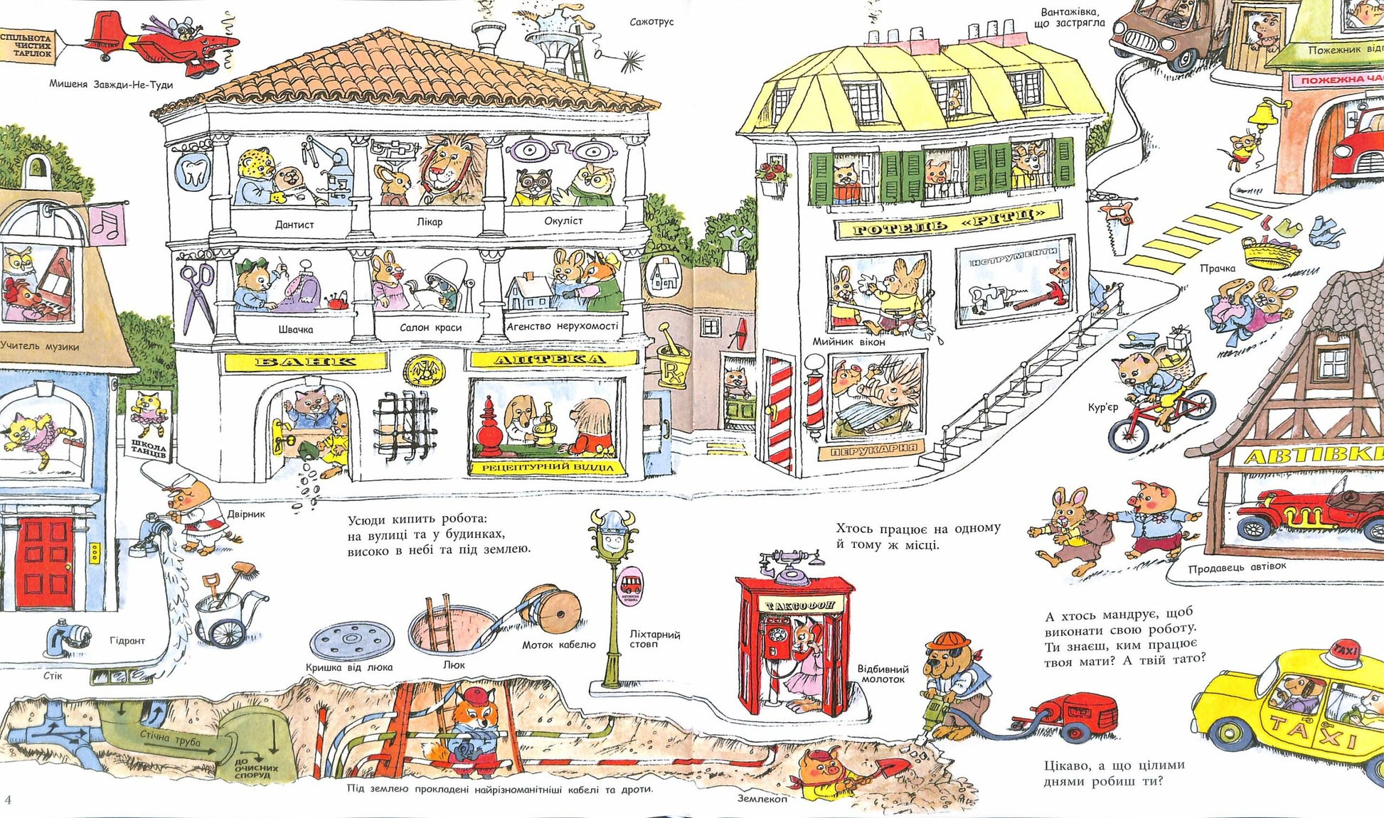 Вперше українською мовою! Найвідоміші віммельбухи відомого художника-ілюстратора Річарда Скаррі. Завдяки ним малюки усього світу дізнаються, що роблять іх батьки на роботі, для чого потрібні автівки та багато чого іншого. За допомогою книг батьки пояснять малюкам, як влаштований світ дорослих.