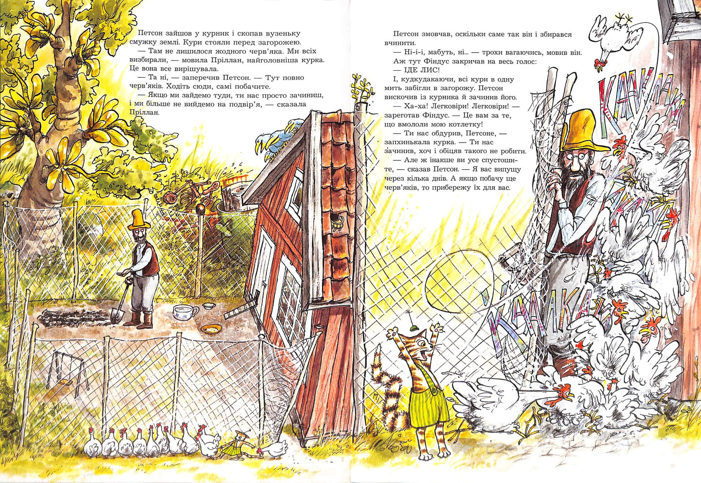 Кіт Фіндус гасав довкола й подохав жуків. Дідуньо Петсон стояв на городі, розглядав землю і розминав її в долоні. «Уже пора, - заявив він. – Сьогодні можна сіяти городину й садити картоплю». Проте Фіндус мав іншу думку, на що можна використати город. До того ж і в курей, і в корів був на те власний переконливий погляд. Тож так чи інак, але все відбувалося дуже незвично.