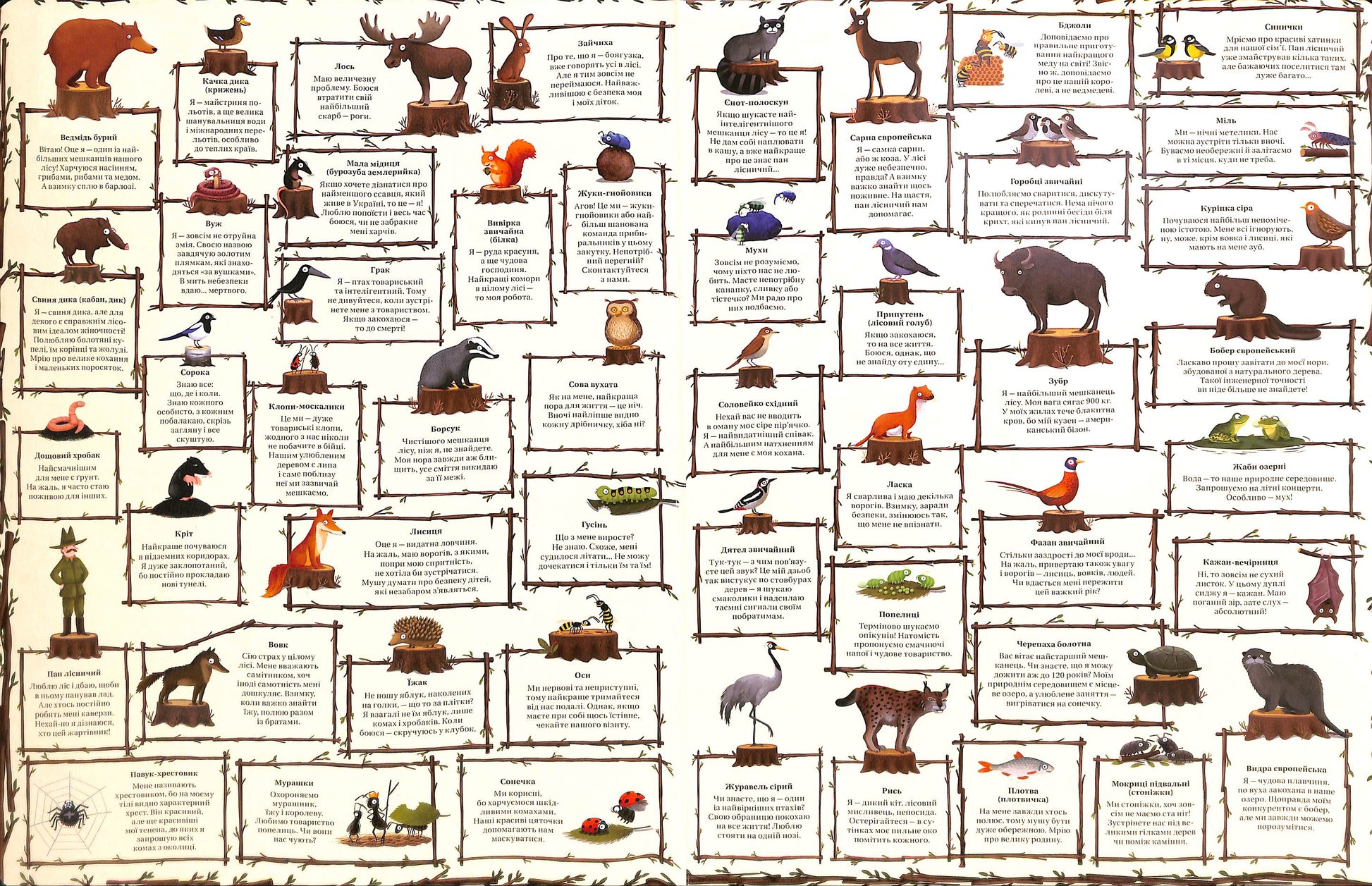 Ви дізнаєтеся про звички тварин: Хто де мешкає? Хто спить вдень, а хто — вночі? Хто що їсть? Хто як готується до зими? Які звірята і птахи паруються на все життя, а які — тільки на шлюбний період? Хто робить найкращі запаси, а хто є найбільшим лісовим лінюхом? Кого не застане зима? Хто та як довго опікується потомством? Відповіді ви знайдете на сторінках цієї незвичайної книги.