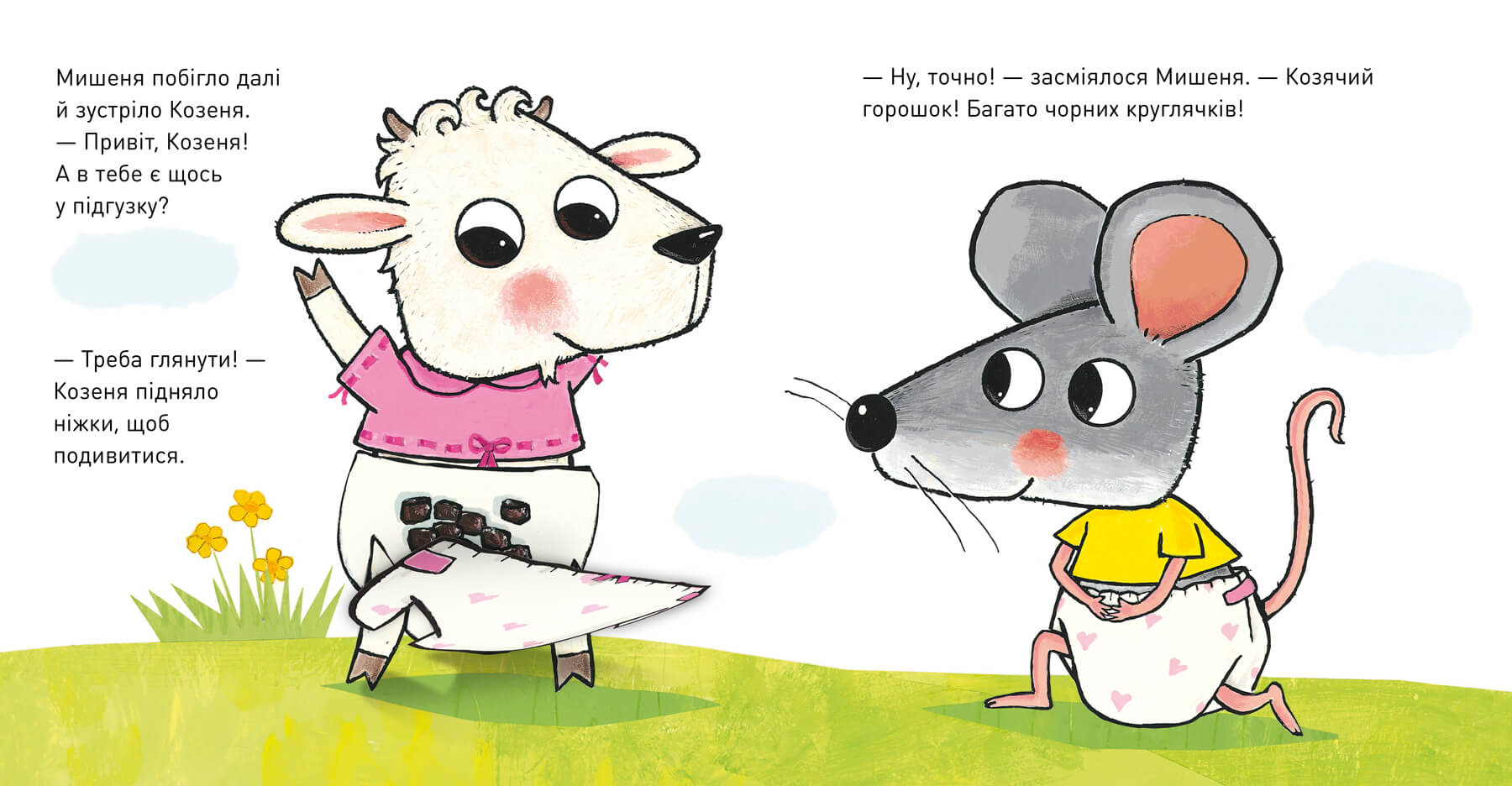 Зайчик, Козеня, Цуценя, Телятко, Лошатко та Порося заглядають у свої підгузки.