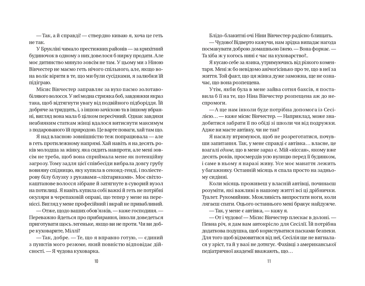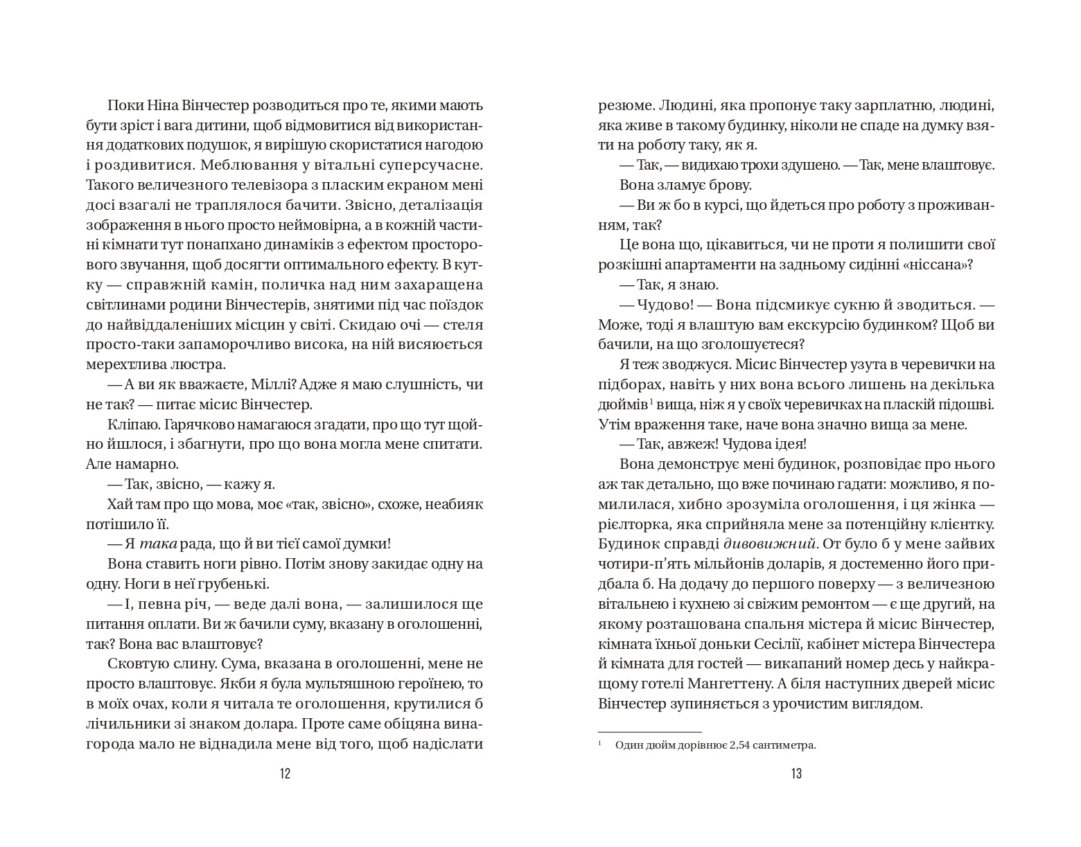 Міллі Келловей втомилася жити в автівці та харчуватися сандвічами, тому радо погодилася працювати служницею у Вінчестерів. Відтепер у неї буде власна кімната, пристойна зарплатня і з’явиться шанс нарешті змінити життя. У Міллі є таємниця, яку вона ретельно приховує. Але жінка навіть не підозрює, чого не розголошують її роботодавці. Щодня Міллі наводить лад у будинку, готує смачну їжу, пере, але стосунки з украй знервованою Ніною Вінчестер напружені. Згодом Міллі дізнається про неї дещо, від чого в жилах стигне кров. Невже ця жінка здатна на таке? І як Ендрю Вінчестер, цей просто ідеальний чоловік, вживається зі справжньою психопаткою? Коли Міллі збагне, що втрапила в пастку, буде вже запізно.