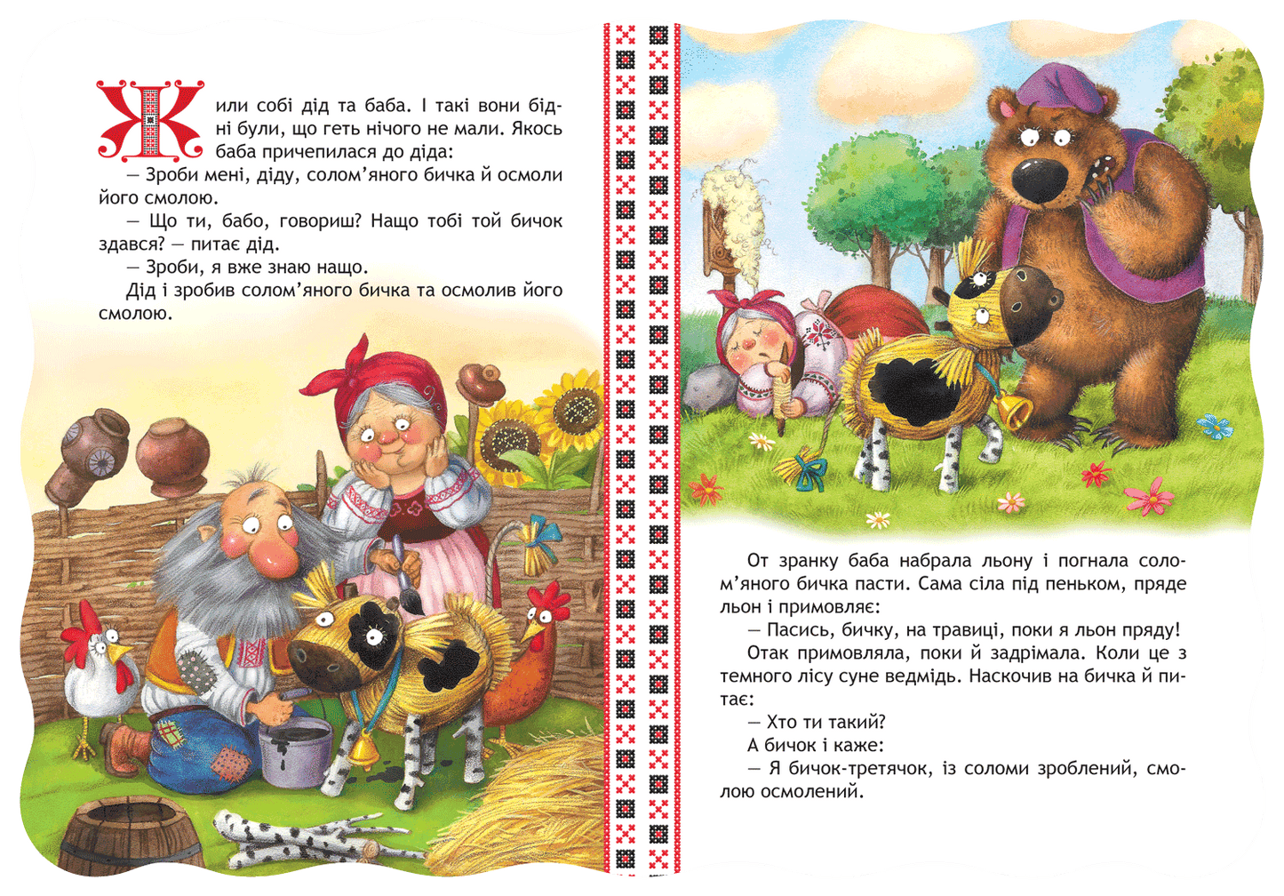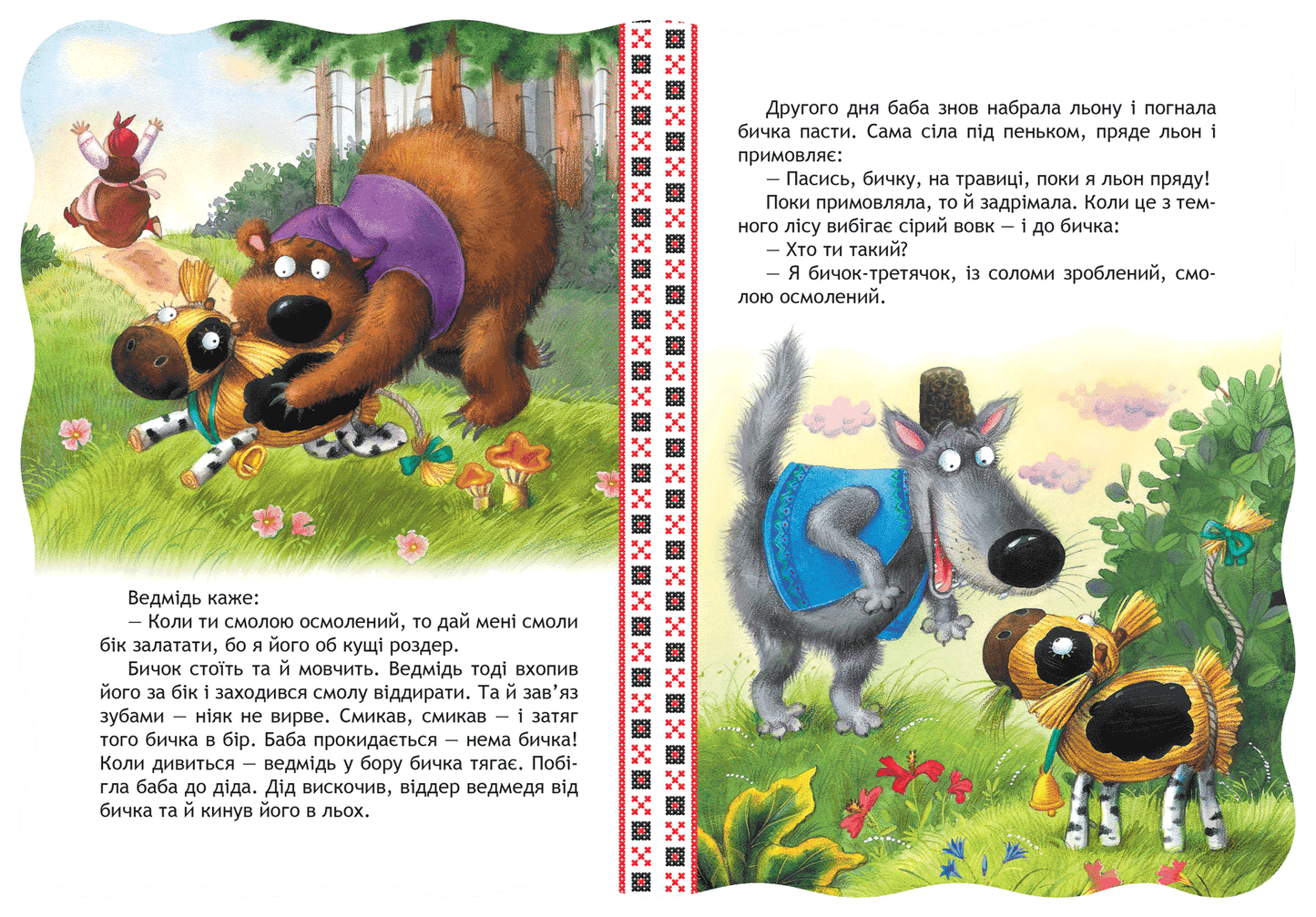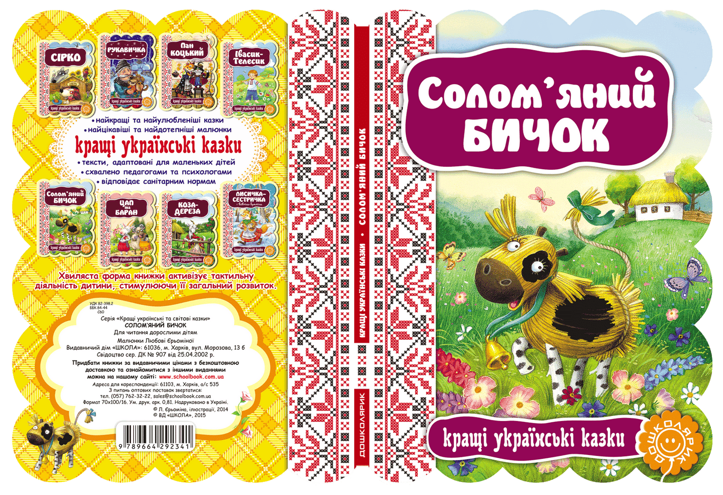Казка про те, як солом’яний бичок-третячок став годівничком діда з бабою, які завдяки йому зробилися багатими господарями. Пропонуємо серію українських народних казок для дітей з дотепними та яскравими малюнками. Тексти казок адаптовано для малюків. Хвиляста форма книжок активізує тактильну діяльність дитини, стимулюючи її загальний розвиток. Книжки схвалені педагогами та психологами та відповідають санітарним нормам.