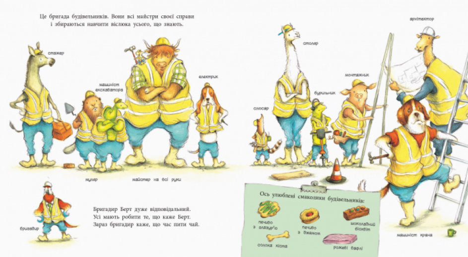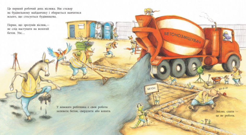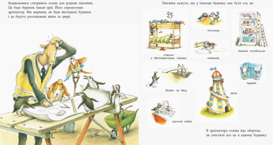 У тварин-будівельників з’явився новий учень. Це віслюк, і він є справжньою ходячою катастрофою! Чи зможе віслюк знайти собі на будівельному майданчику справу до душі? І чи отримають пінгвіни будинок своєї мрії? Чудова книга для дітей, які обожнюють гратися у будівництво.