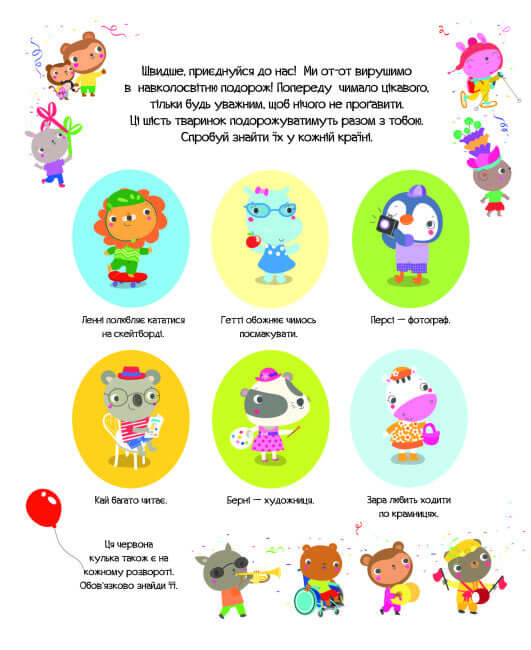 Книжка, яка поєднує найцікавіші заняття для дітей: вімельбух, наліпки та головоломки. Герої-тварини запрошують маленьких дослідників у незвичайну навколосвітню подорож. Кожен розворот книжки — це нова зупинка, під час якої треба уважно дослідити місцевість і відшукати певні предмети та об’єкти. А наприкінці мандрівки за допомогою наліпок, цікавих завдань і мапи світу можна створити свої маршрути і вигадати власні пригоди.