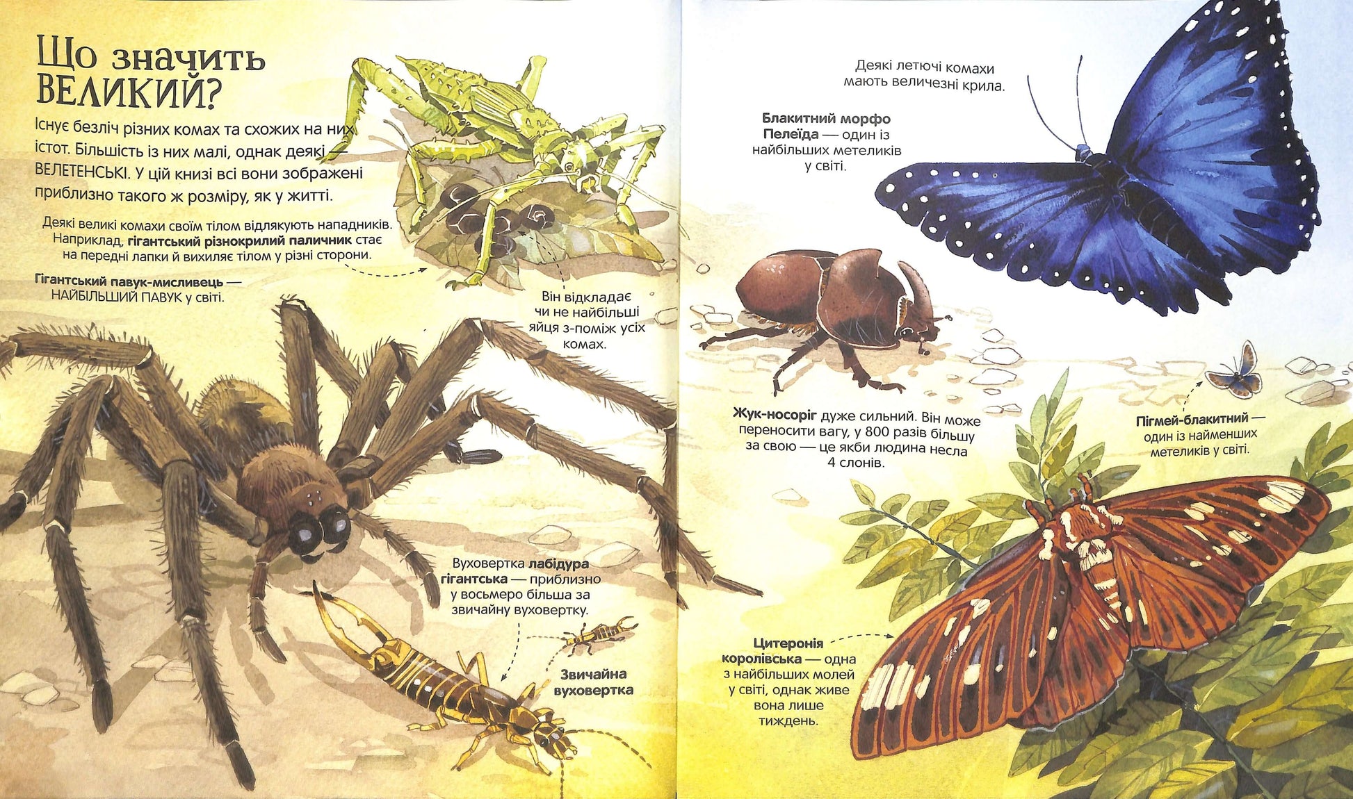 • «Велика книга комах і не тільки» розповість маленьким дослідникам про найсильніших, найдовших, найважчих комах, познайомить з невидимими та смертоносними видами, а також навчить порівнювати та класифікувати їх.