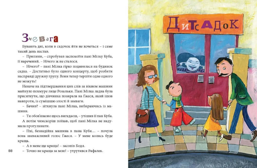 У «Великій книзі почуттів» ви знайдете, зокрема, історії про смуток, сором, зневагу, ревнощі, любов, ненависть, чесність, повагу, сміливість, співчуття, страх, почуття вини, а ще розповідь про те, звідки беруться діти. Наприкінці кожного оповідання є практичні поради для дітей та дорослих.