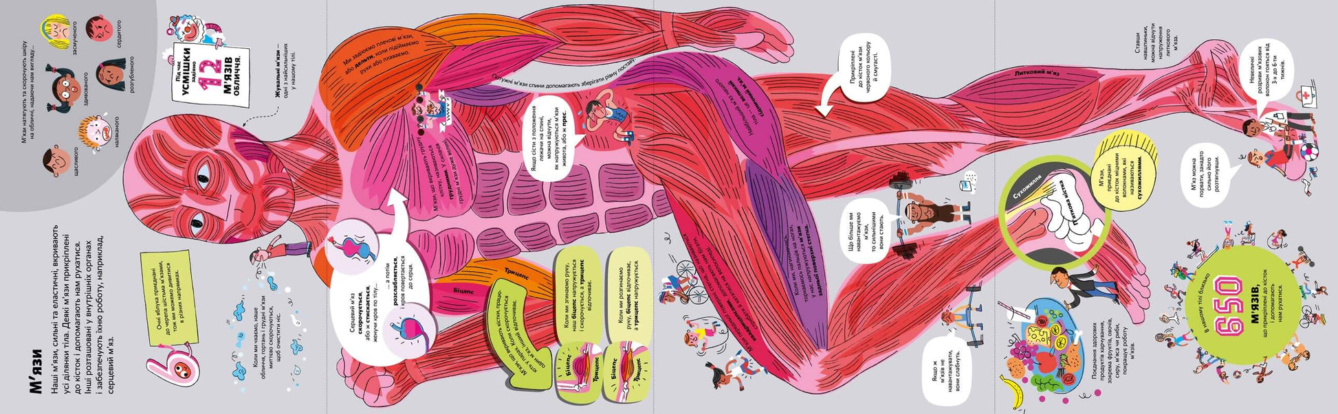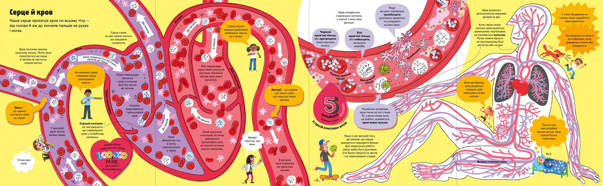 - Окрім велетенських схем із будовою, на дитину чекає безліч фактів на кожній сторінці, які покажуть дитині взаємозв’язок між харчуванням, фізичним станом і функціями організму.