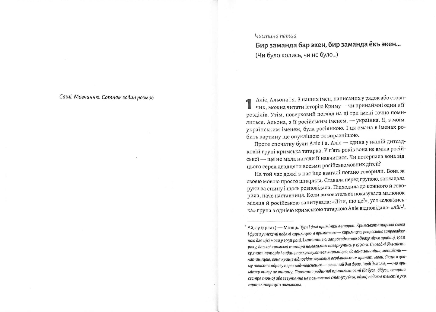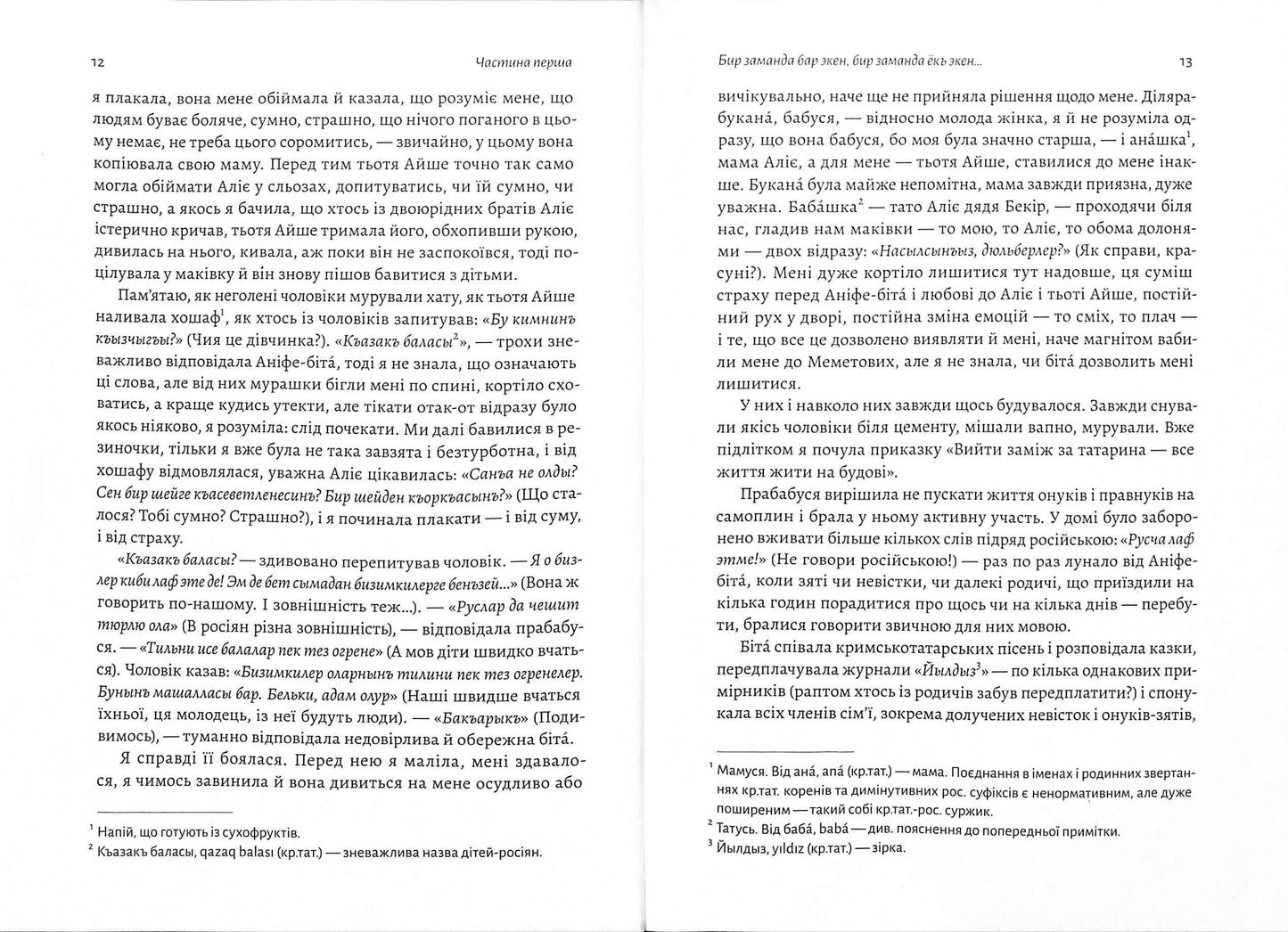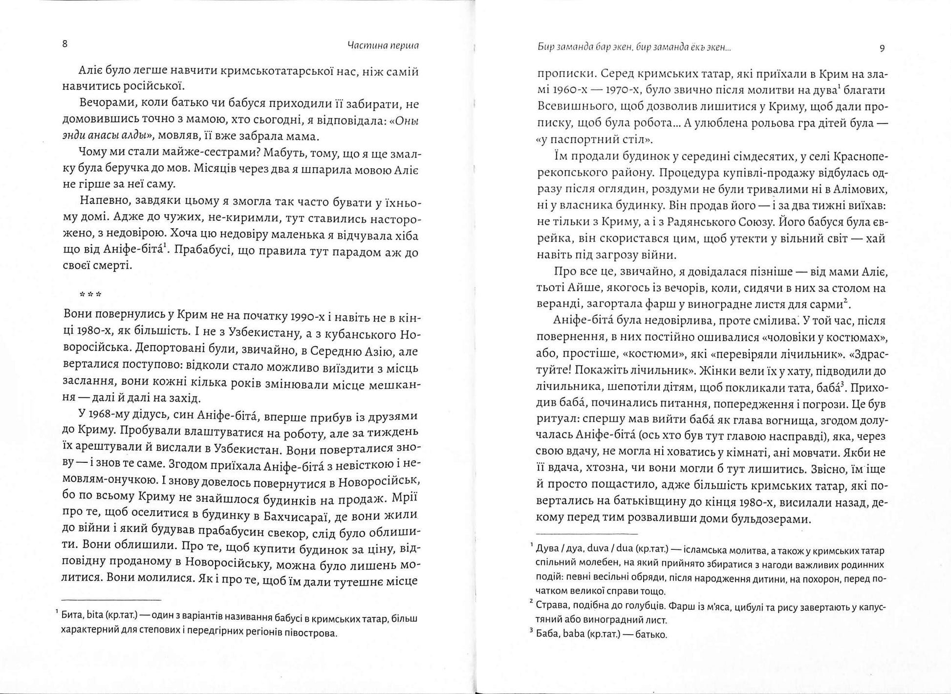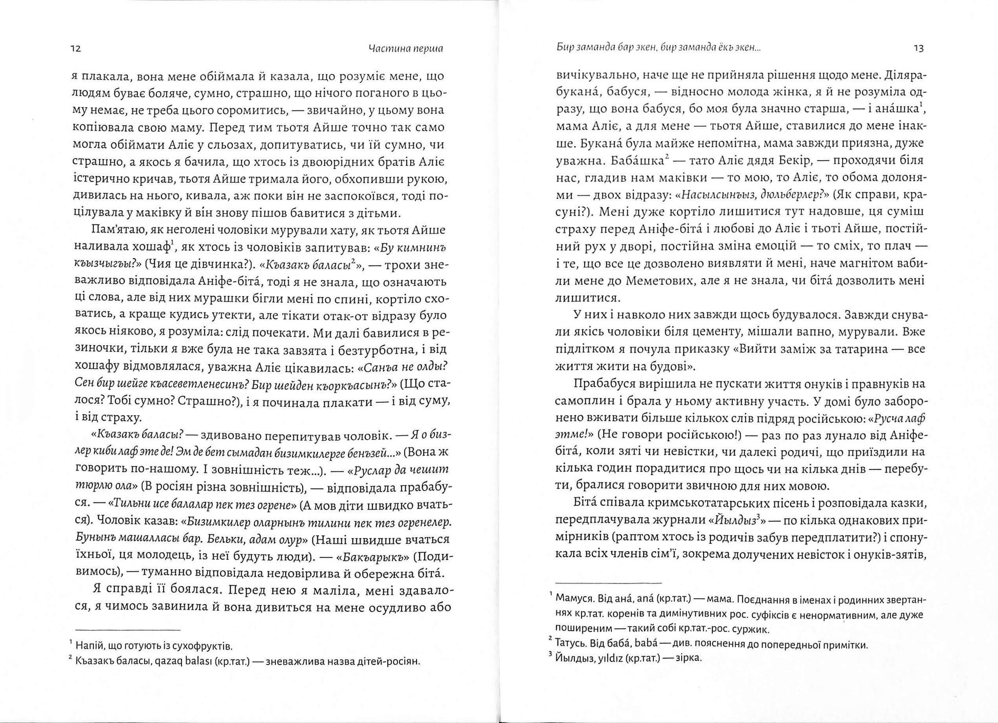 Наче орнамент, у романі переплітаються кримськотатарська культура і українська історія. На сторінках книжки читач зустрінеться з кримськими татарами, караїмами, українцями, росіянами, німцями, євреями, греками, вірменами Криму, крок за кроком відкриватиме шафи з родинними скелетами. Разом з головною героїнею та її подругою Аліє пройде шлях від їхнього дитинства – з 1990-х – аж до окупації півострова Росією в 2014-му, з екскурсами в давнішу історію Криму.